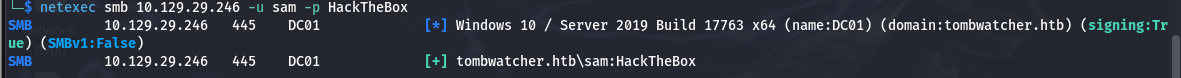 └─$ netexec smb 10.129.29.246 -u sam -p HackTheBox SMB 10.129.29.246 445 DC01 [*] Windows 10 / Server 2019 Build 17763 x64 (name:DC01) (domain:tombwatcher.htb) (signing:True) (SMBv1:False) SMB 10.129.29.246 445 DC01 [+] tombwatcher.htb\sam:HackTheBox