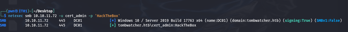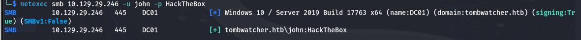 └─$ netexec smb 10.129.29.246 -u john -p HackTheBox SMB 10.129.29.246 445 DC01 [*] Windows 10 / Server 2019 Build 17763 x64 (name:DC01) (domain:tombwatcher.htb) (signing:True) (SMBv1:False) SMB 10.129.29.246 445 DC01 [+] tombwatcher.htb\john:HackTheBox