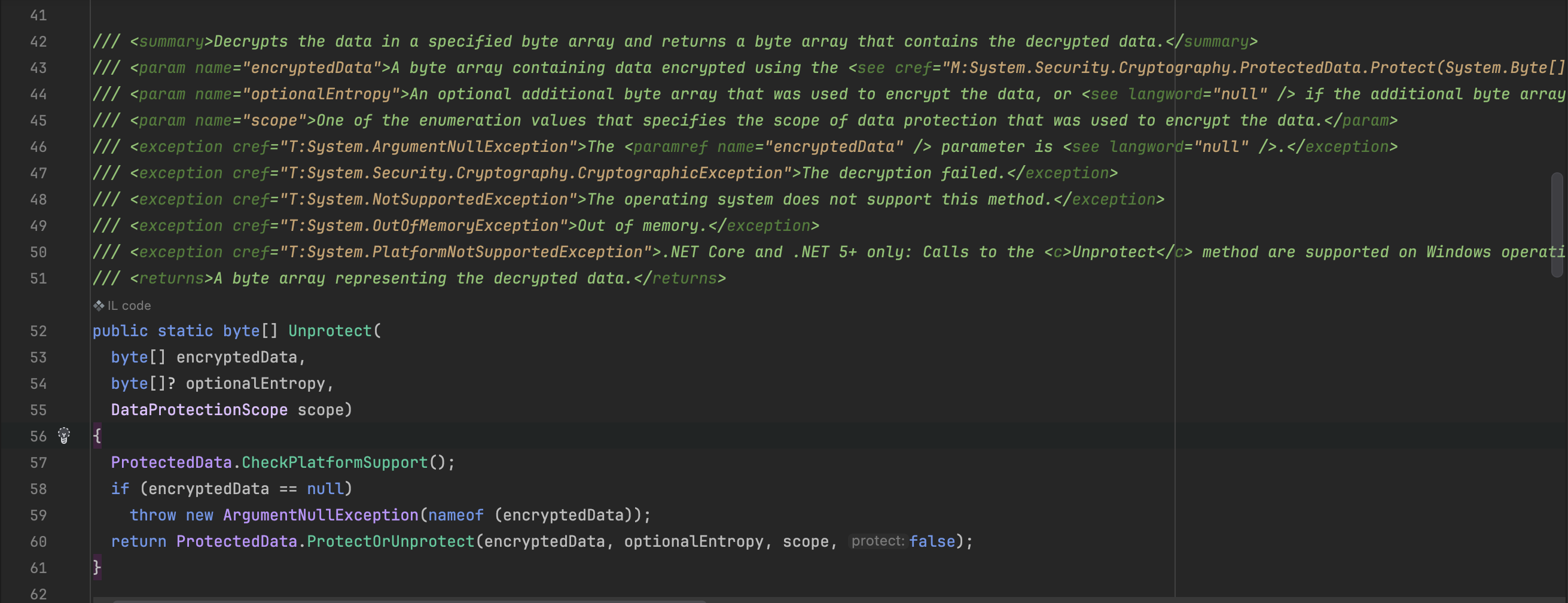 /// <summary>Decrypts the data in a specified byte array and returns a byte array that contains the decrypted data.</summary> /// <param name="encryptedData">A byte array containing data encrypted using the <see cref="M:System.Security.Cryptography.ProtectedData.Protect(System.Byte[],System.Byte[],System.Security.Cryptography.DataProtectionScope)" /> method.</param> /// <param name="optionalEntropy">An optional additional byte array that was used to encrypt the data, or <see langword="null" /> if the additional byte array was not used.</param> /// <param name="scope">One of the enumeration values that specifies the scope of data protection that was used to encrypt the data.</param> /// <exception cref="T:System.ArgumentNullException">The <paramref name="encryptedData" /> parameter is <see langword="null" />.</exception> /// <exception cref="T:System.Security.Cryptography.CryptographicException">The decryption failed.</exception> /// <exception cref="T:System.NotSupportedException">The operating system does not support this method.</exception> /// <exception cref="T:System.OutOfMemoryException">Out of memory.</exception> /// <exception cref="T:System.PlatformNotSupportedException">.NET Core and .NET 5+ only: Calls to the <c>Unprotect</c> method are supported on Windows operating systems only.</exception> /// <returns>A byte array representing the decrypted data.</returns> public static byte[] Unprotect( byte[] encryptedData, byte[]? optionalEntropy, DataProtectionScope scope) { ProtectedData.CheckPlatformSupport(); if (encryptedData == null) throw new ArgumentNullException(nameof (encryptedData)); return ProtectedData.ProtectOrUnprotect(encryptedData, optionalEntropy, scope, false); }